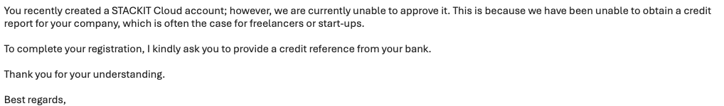This has literally never happened to us anywhere. Not at any cloud provider, not at any SaaS. We have a legitimate company that's existed for years and a valid credit card from a reputable bank. Very strange. While waiting for STACKIT I'd already moved on to testing other providers.